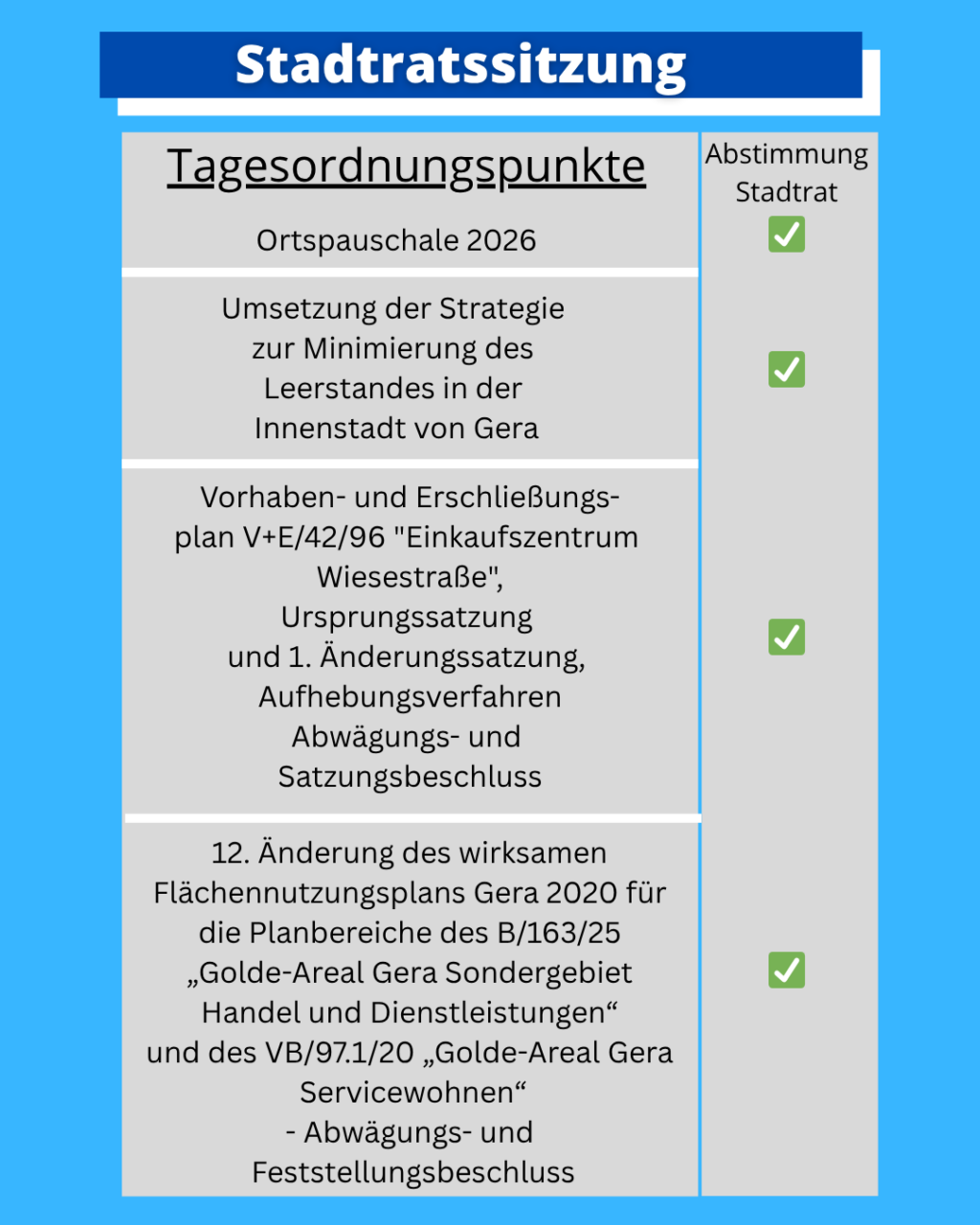 Am 28.01.2026 fand die 1.Sitzung des Stadtrates von Gera in diesem Jahr statt. Wir starteten wie immer mit der Einwohnerfragestunde. Folgende Themen wurden von Bürgern angesprochen und Fragen dazu gestellt:… weiterlesen