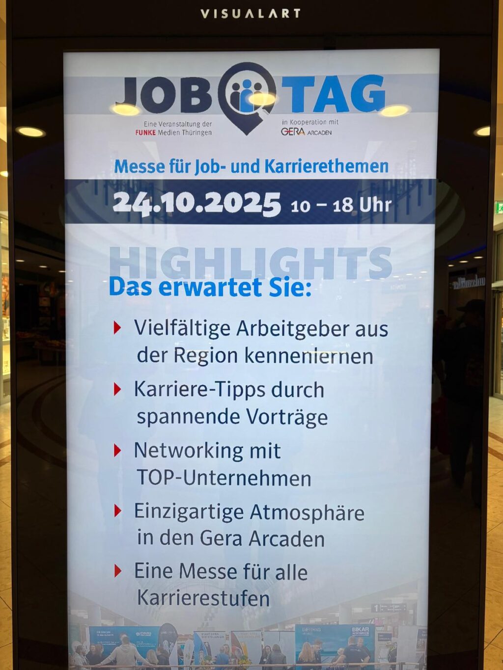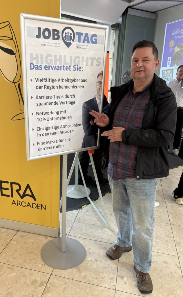 Am 24. Oktober 2025 besuchten unsere Fraktionsmitglieder Kerstin und Dr. Jörg Müller den Job Tag in den Geraer Arcaden. Dort informierten sie sich über die vielfältigen Job- und Ausbildungsmöglichkeiten in der Region. Diese Messe spielt eine wichtige Rolle bei der Fachkräftesicherung und der Stärkung des Wirtschaftsstandortes Gera.